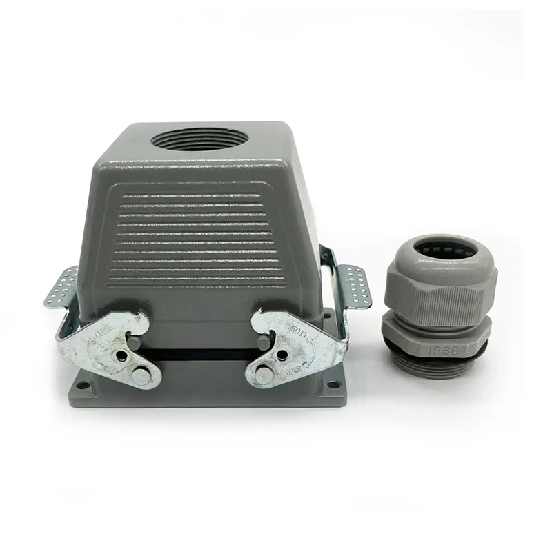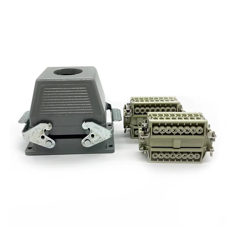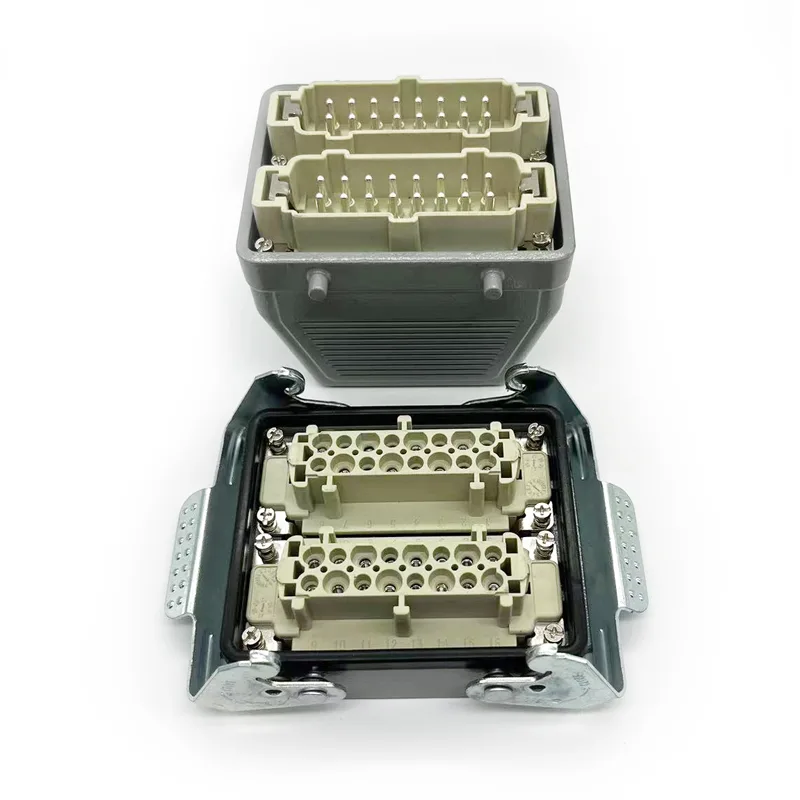 32 ピン TG ヘビーデューティ コネクタは、オスの上部ハウジング部品です。オスのインサート部品またはメスのインサート部品と一緒に使用する必要があります。 通常はHE-016-M 2枚で固定しますが、特殊なお客様のご要望でHE-016-F 2枚で組み立てていただく場合がございます。 HSB-016のハウジングでもあります。 IP65の防水機能を備え、屋外でも使用できるものとなっています。 32 ピン TG ヘビーデューティ コネクタは PG29 と一致します。顧客が異なるケーブルグランドサイズの要求を持っている場合、我々は受け入れて生産することができます。