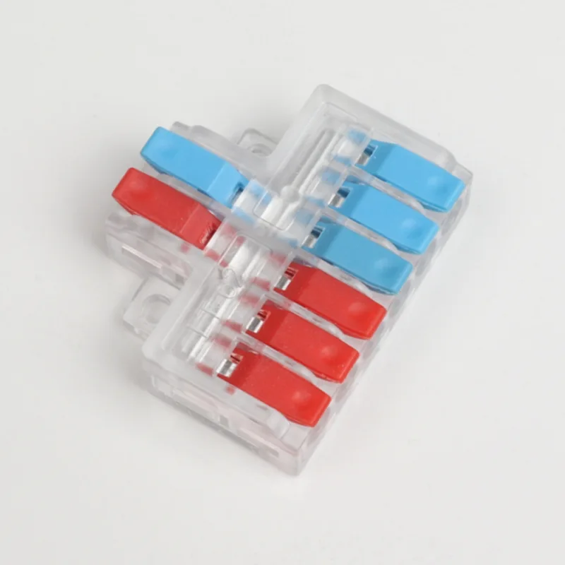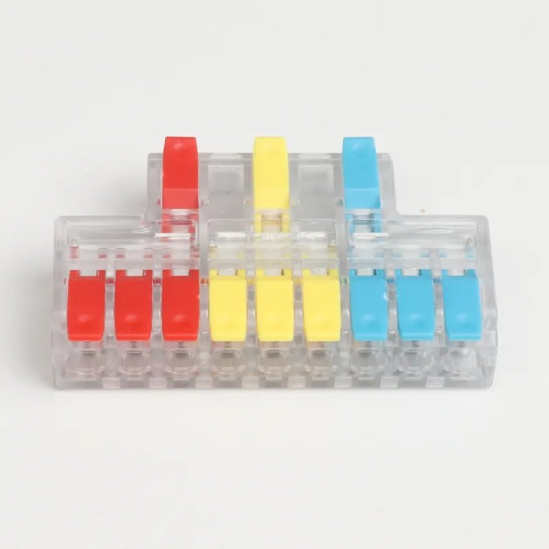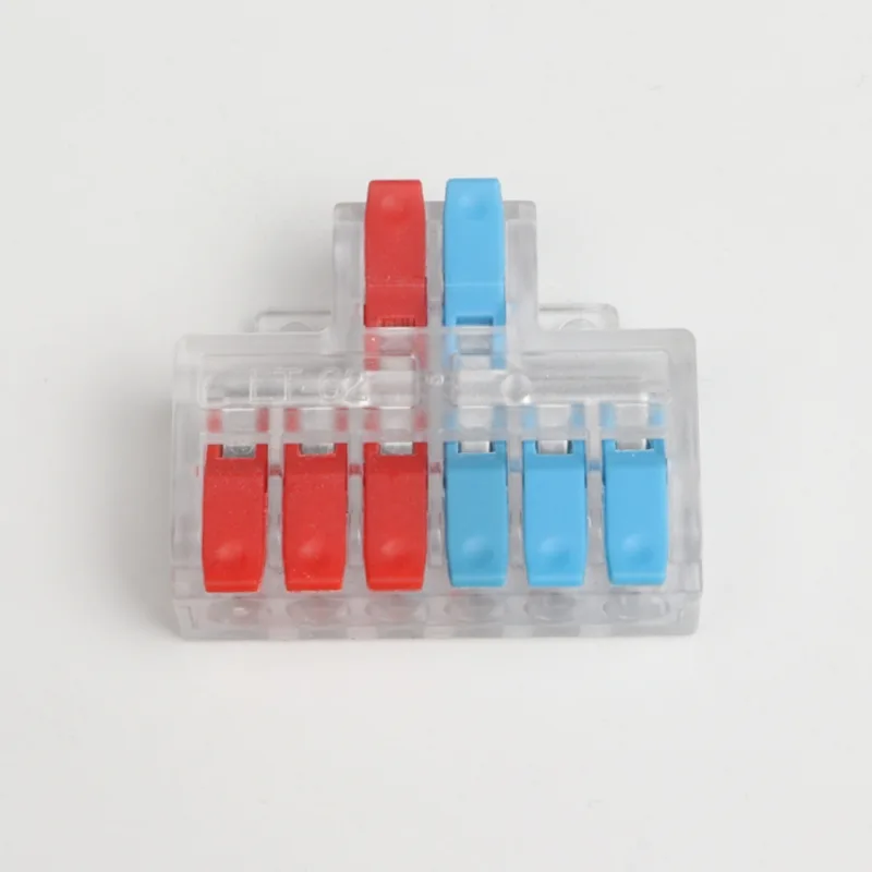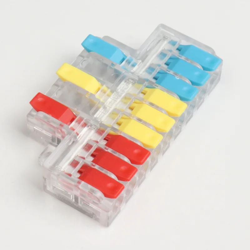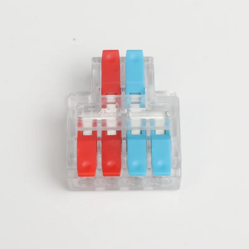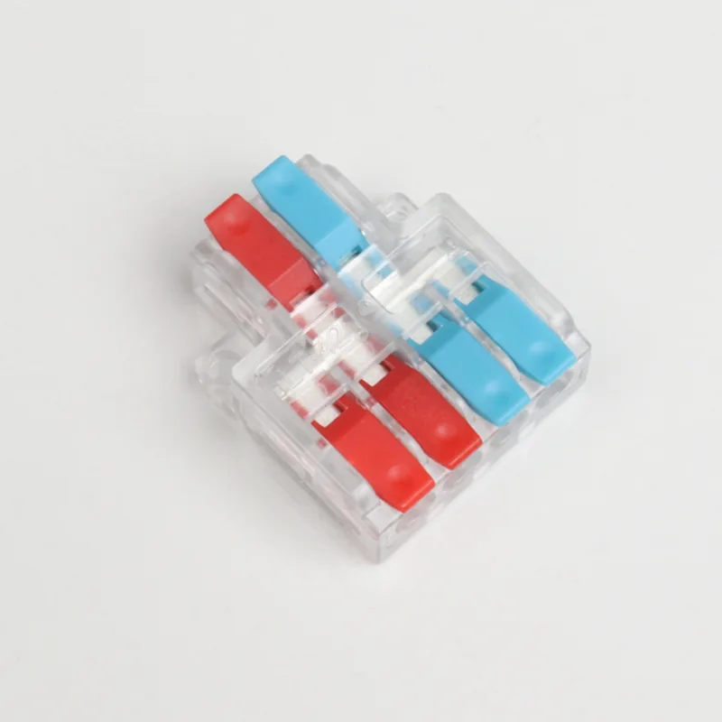 2 入力 4 出力ミニ スプライシング ワイヤ クイック コネクタは、当社の通常の配電配線端子よりも小さい形状です。ミニバージョンは小型の防水ケース内で使用できます。ハンドルの仕切りの色を変えることで配線方向の差別化を実現します。