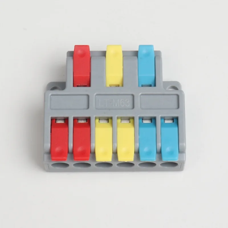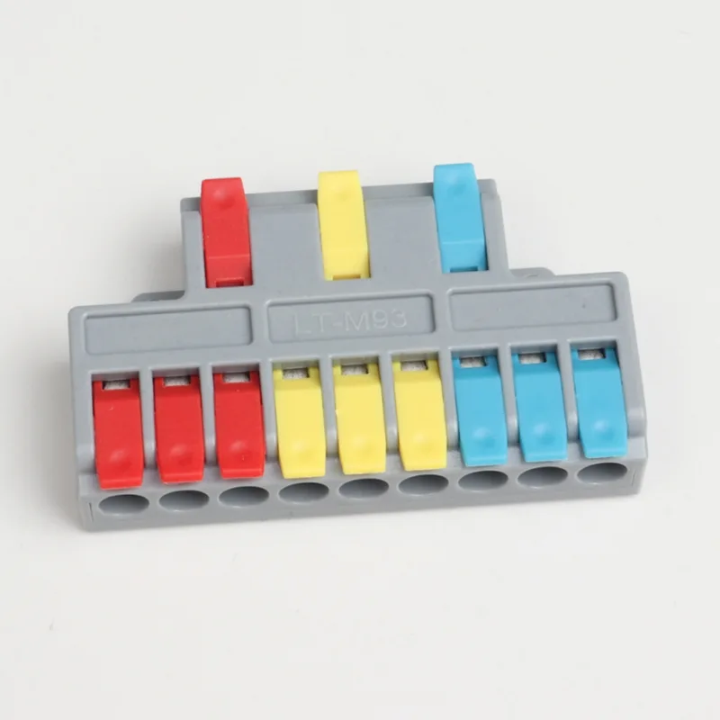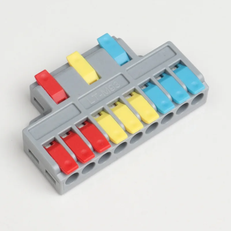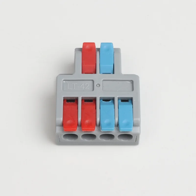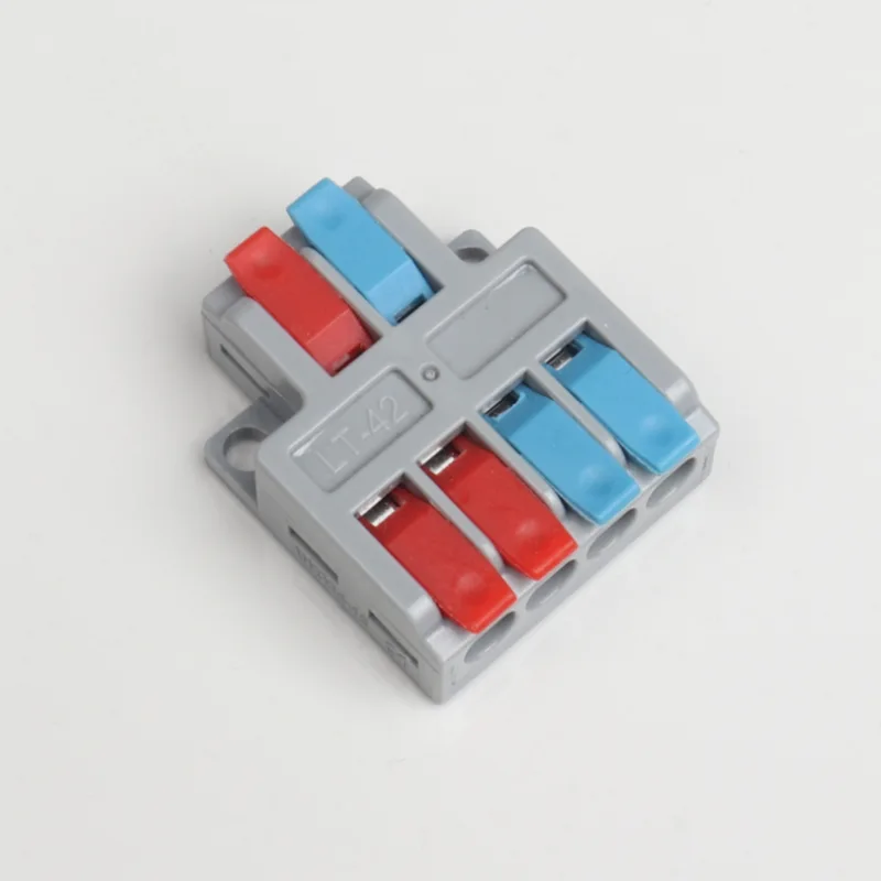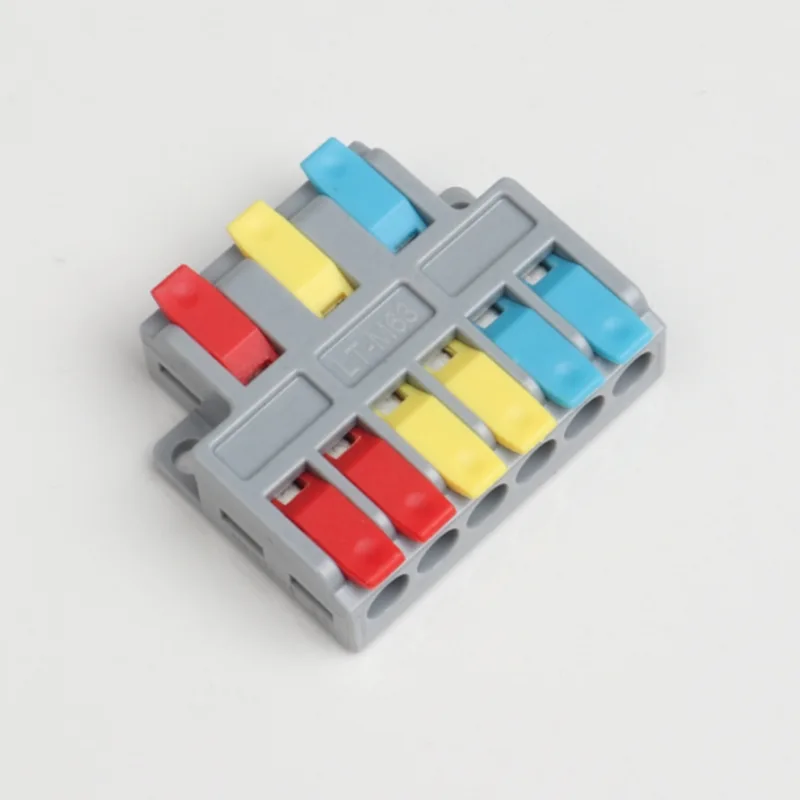 2 入力 4 出力ミニ スプライシング ワイヤ クイック コネクタは、当社の通常の配電配線端子よりも小さい形状です。ミニバージョンは小型の防水ケース内で使用できます。ハンドルの仕切りの色を変えることで配線方向の差別化を実現します。